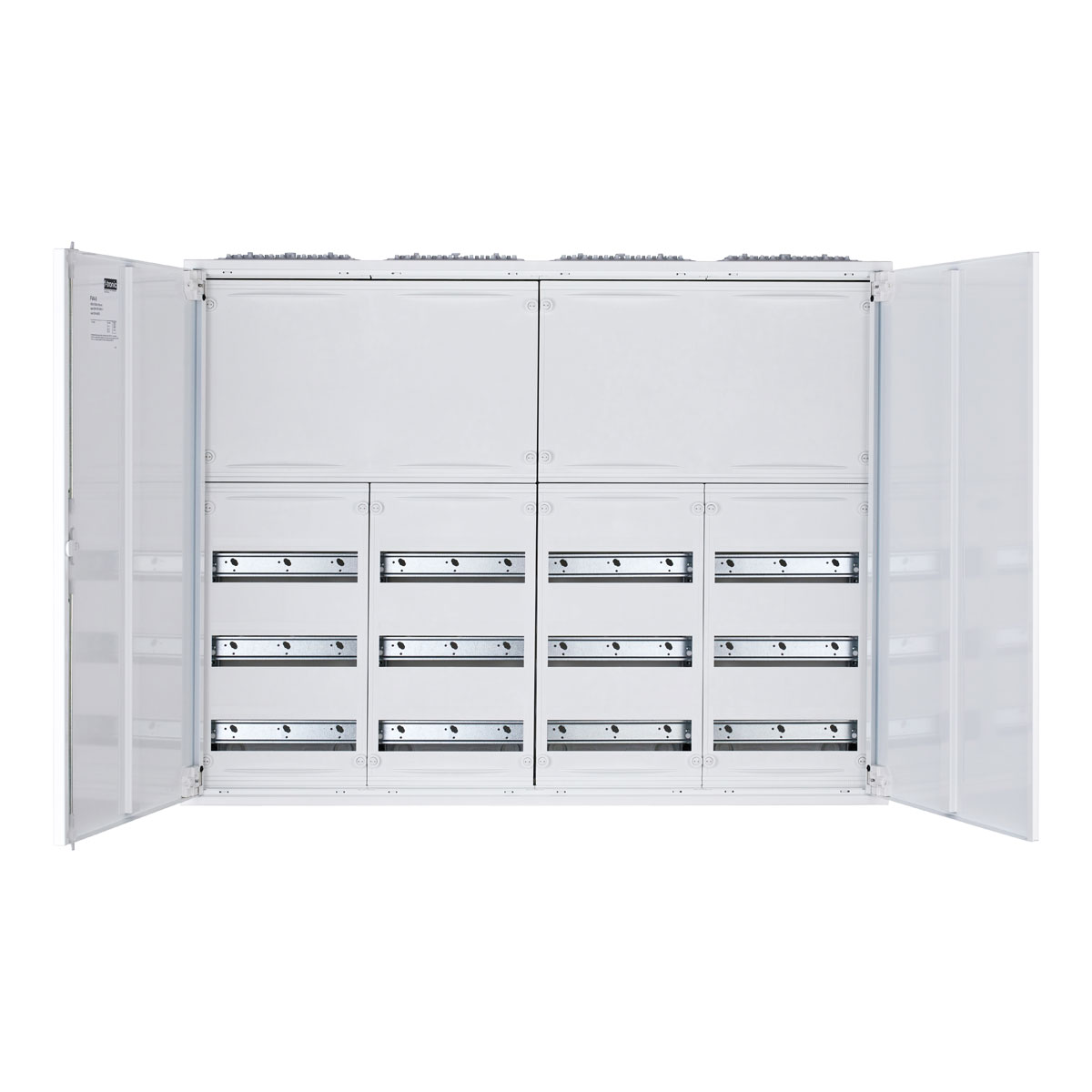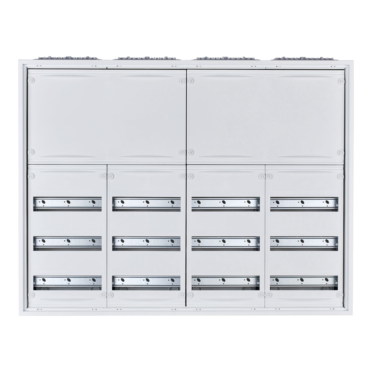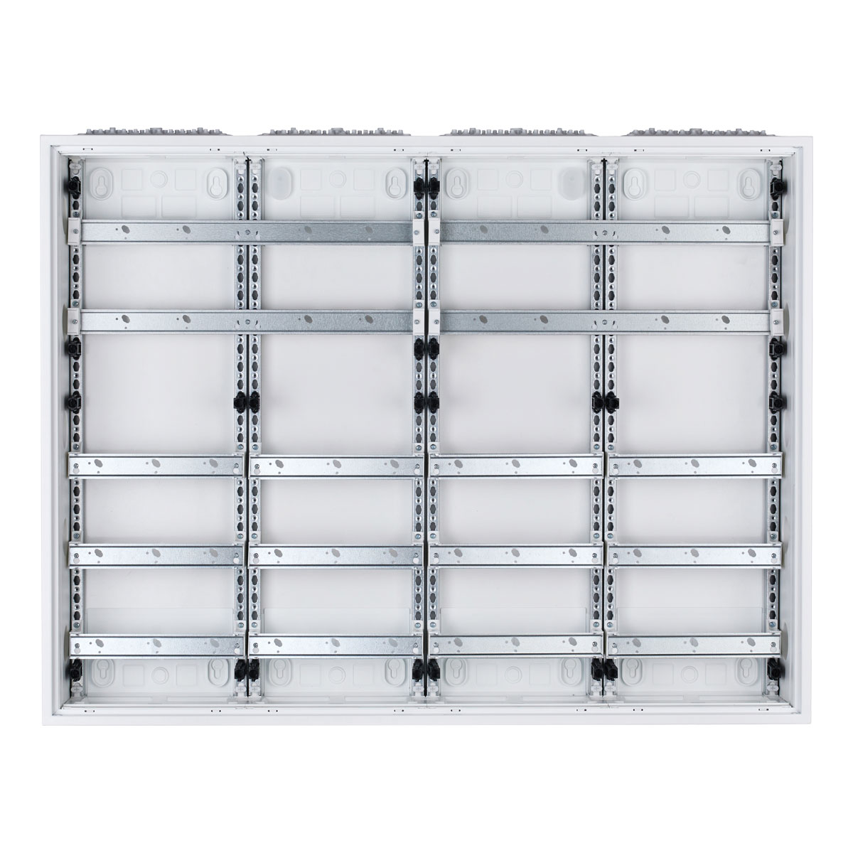 Der F‑Tronic Feldverteiler FV4‑5 (4‑feldrig, 5‑reihig und 240TE) bietet mit seiner großzügigen Kapazität von 240 Teilungseinheiten ein leistungsstarkes System für umfangreiche Elektroinstallationen. Mit vier Feldern und fünf Reihen verfügt dieser Aufputz-Feldverteiler über Platzreserven, die besonders bei komplexen Verteilungen oder zukunftsorientiertem Ausbau wichtig sind. Die spezielle Ausführung mit geschlossener Abdeckung in den oberen zwei Reihen sorgt für eine saubere Struktur- und Schutzebene.
