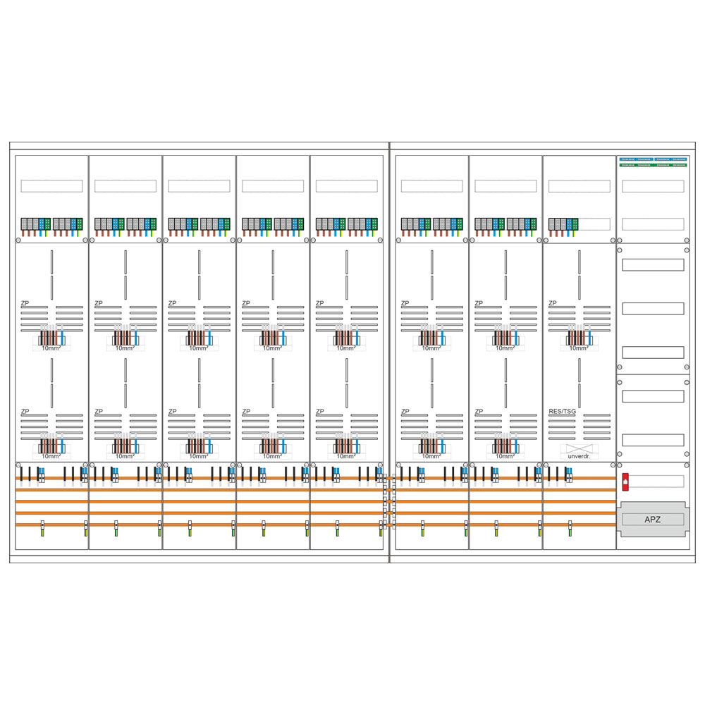 - 1 Verteilerfeld 7-reihig inkl. N/PE-Schiene + APZ-Platz