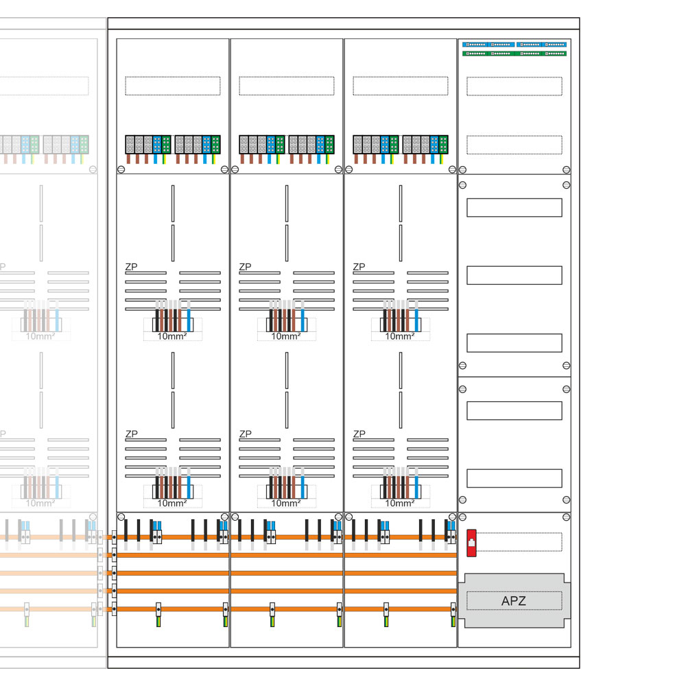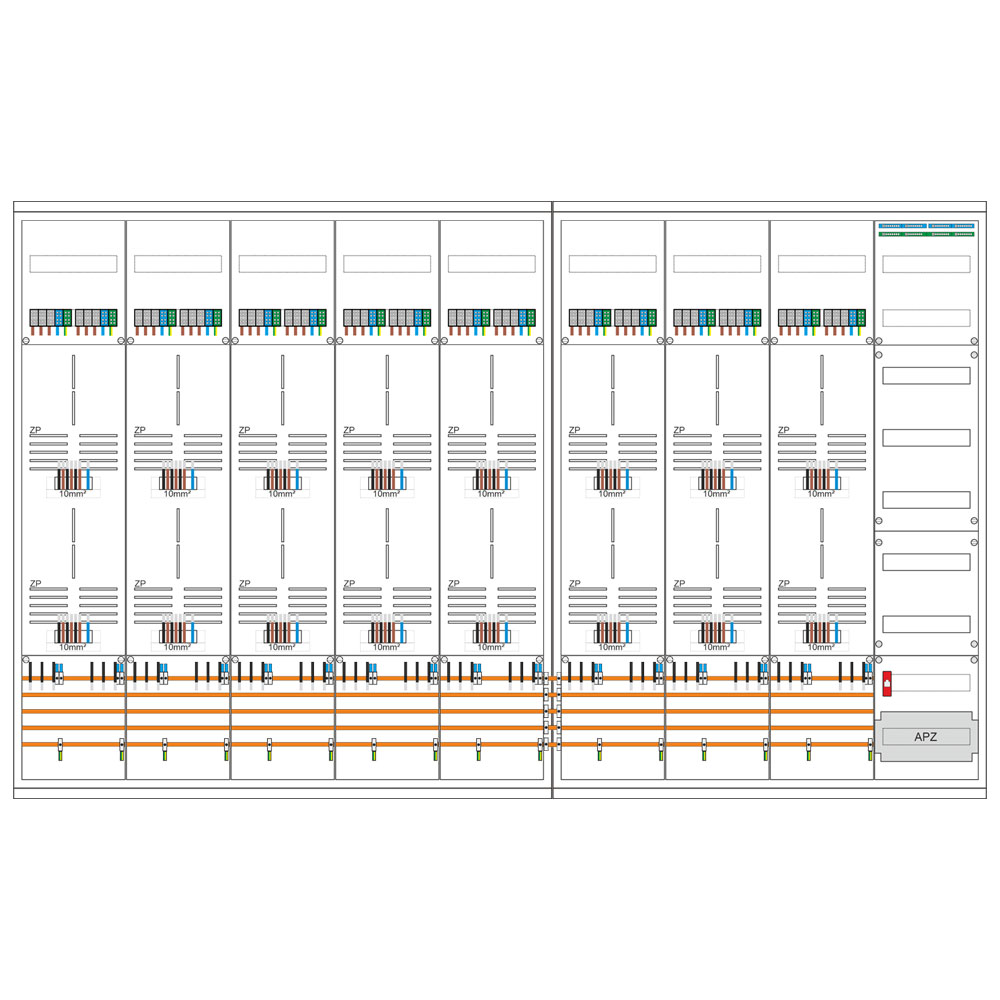 Das 7-reihige Verteilerfeld ist zusätzlich mit einem APZ-Platz (Anschlusspunkt Zählerplatz) ausgestattet. Damit wird der Schrank ideal für den Einsatz intelligenter Messsysteme vorbereitet und bietet eine hohe Zukunftssicherheit für den Betrieb.