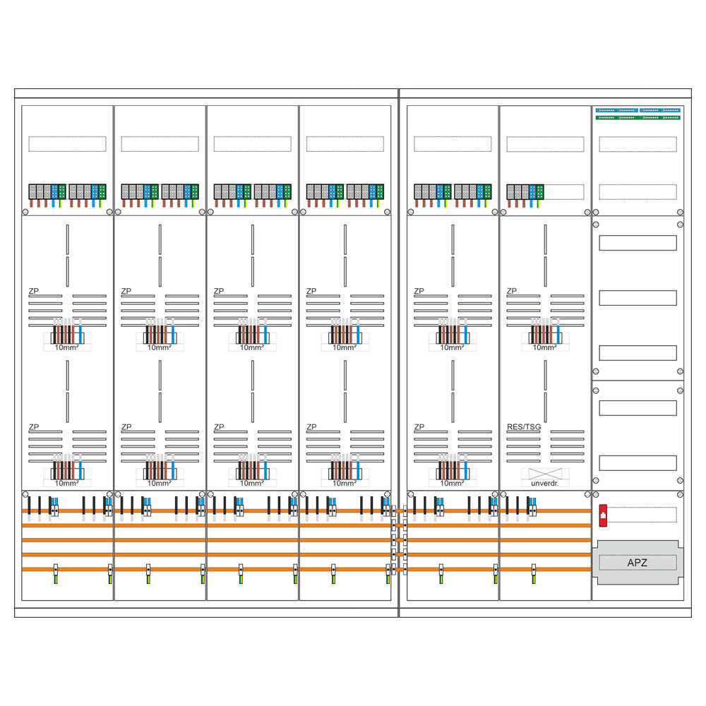 - 1 Verteilerfeld 7-reihig inkl. N/PE-Schiene + APZ-Platz