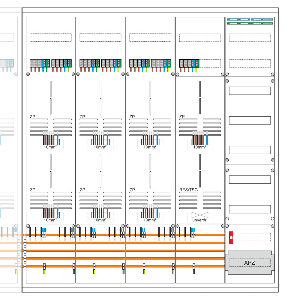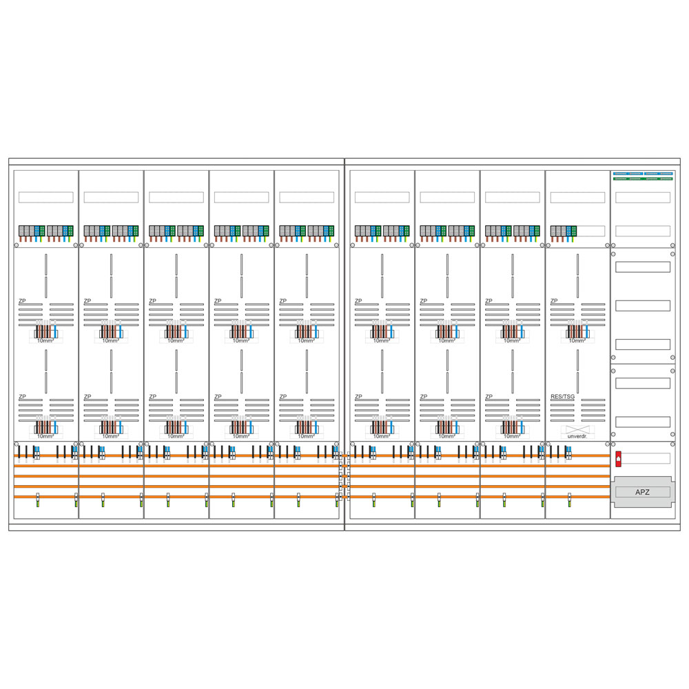 - 1 Verteilerfeld 7-reihig inkl. N/PE-Schiene + APZ-Platz