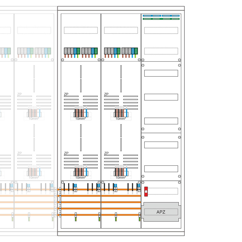 Das integrierte 7-reihige Verteilerfeld ist mit einem APZ-Platz ausgestattet und erfüllt damit alle Anforderungen für moderne Mess- und Kommunikationstechnik, wie sie im Rahmen intelligenter Messsysteme (Smart Metering) notwendig sind. So ist der Schrank bestens auf die aktuellen und zukünftigen Normen vorbereitet.